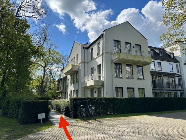 We bevinden ons in het witte nieuwbouw-appartementcomplex van Residentie Les Belles. Dit bevindt zich ongeveer in de helft van de straat, een 300 meter van het eetcafé 'T Zonneke.